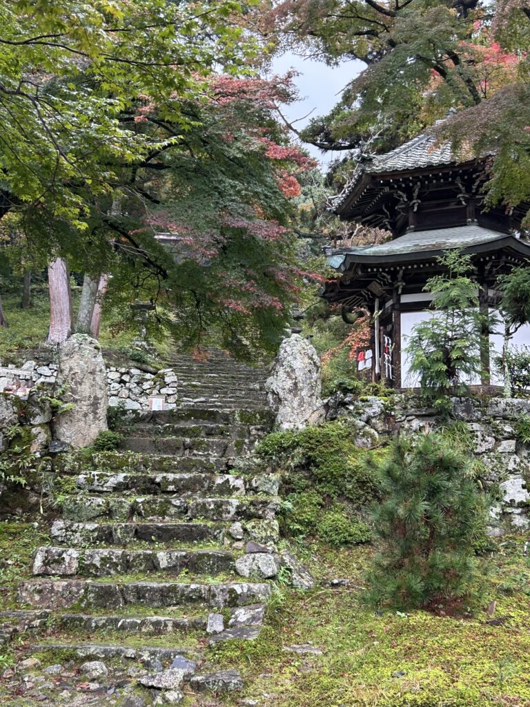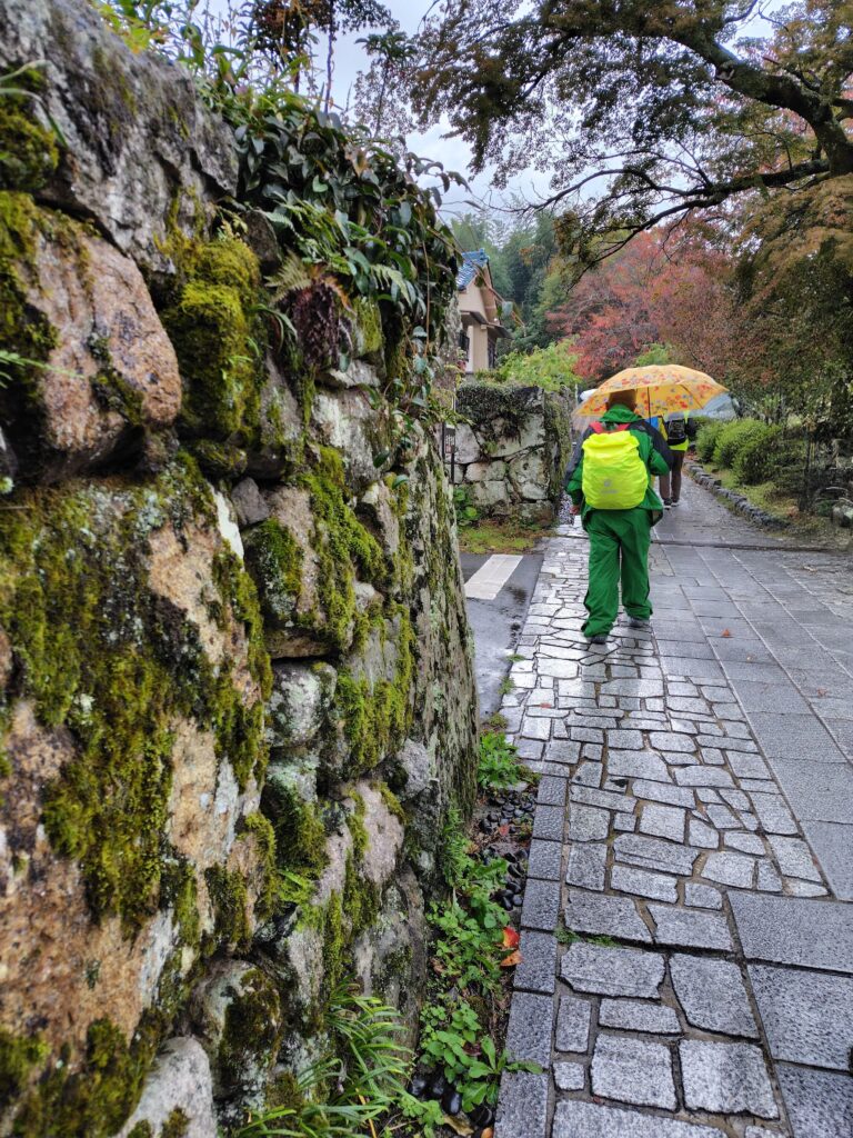 穴太積みの石垣のモスグリーンの苔、かわいい花柄の傘、少し紅葉した木々、ちらっと見える青い屋根 色のコントラストが素晴らしいです。