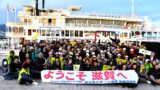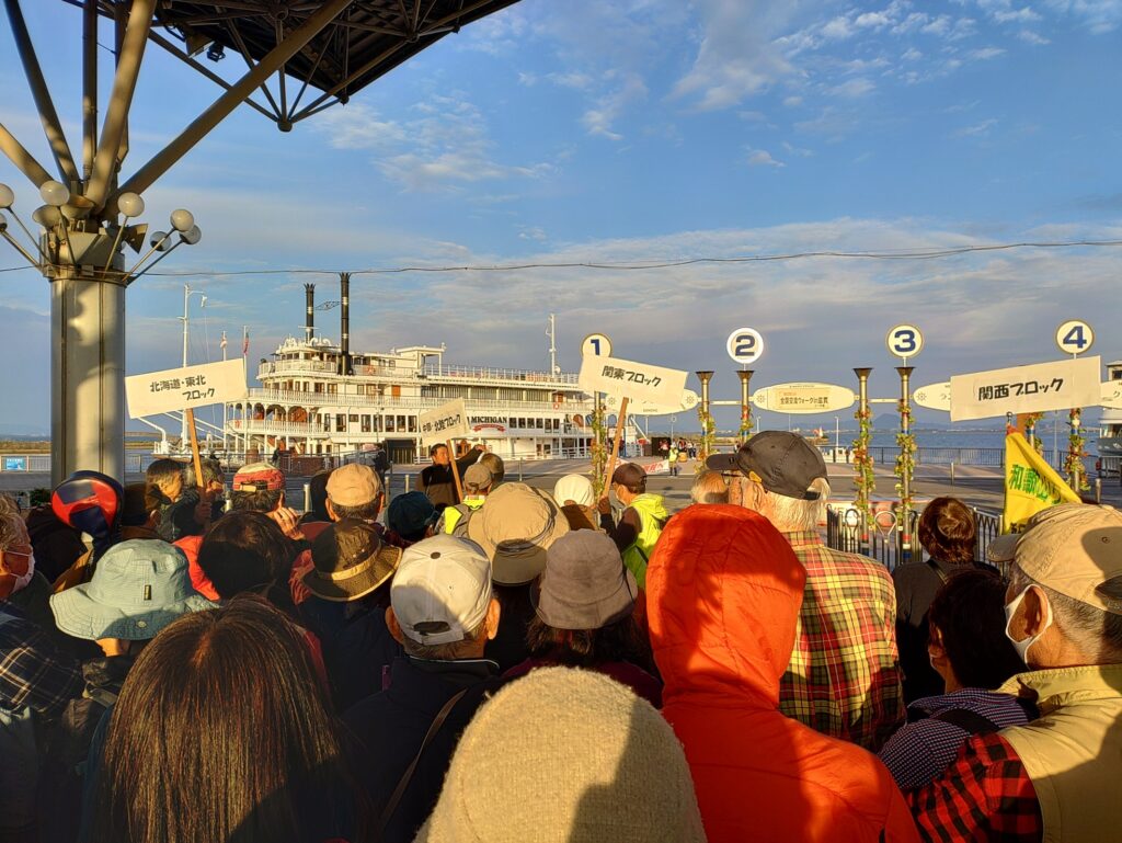 「夕陽に見送られ乗船を待つ全国の仲間たち」