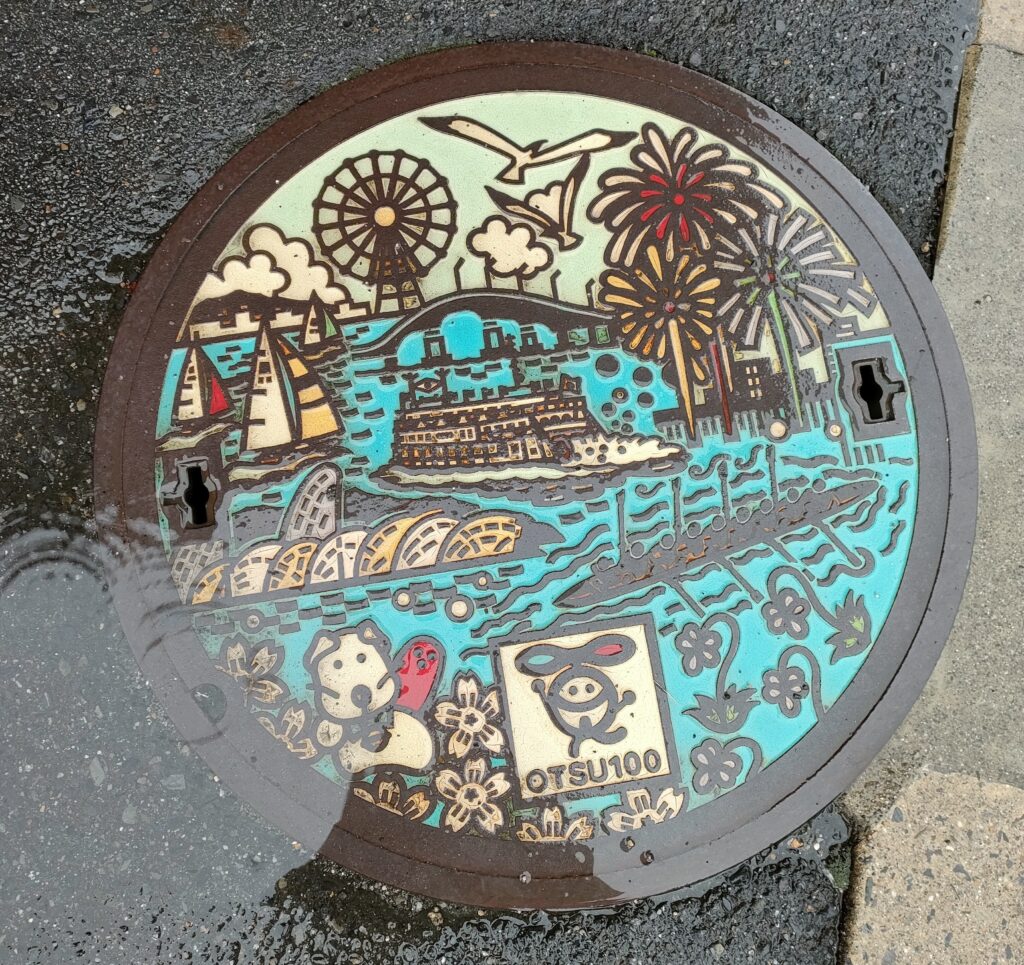 本人談:大津市の市制100周年を記念して作られたマンホール。市のシンボル琵琶湖をベースに、琵琶湖大橋・外輪船ミシガン・ヨット・観覧車・びわ湖花火大会・レガッタ・びわ湖花噴水・市の花「エイザンスミレ」・市の木「ヤマザクラ」・市の鳥「ゆりかもめ」・市制100周年記念イベントキャラクター犬のもも(百)ちゃんが盛り込まれているそうです。大津市まるごとという印象でした。