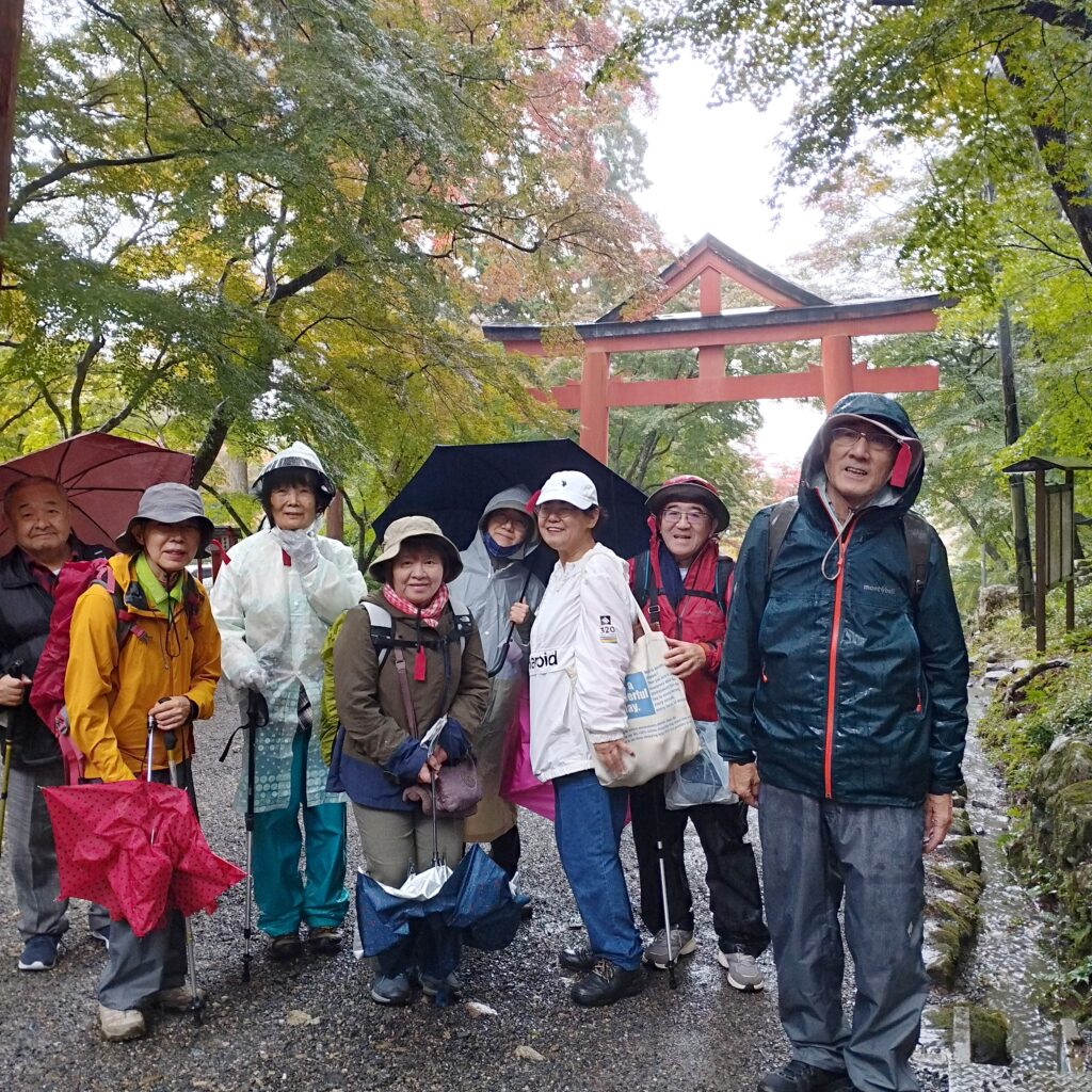雨の中で松本理事長もちょっとくねっとなっておちゃめな感じ。仲間の皆さんも笑顔!両方からの紅葉しつつある木々と朱色の鳥居のコントラストが美しい。雨もいいですね。